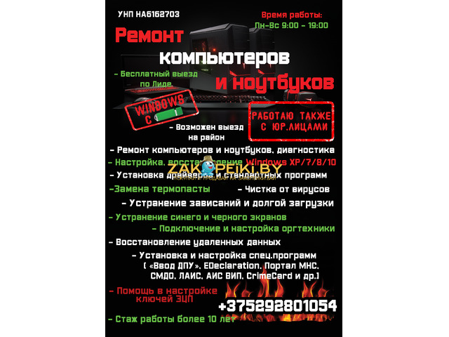 Бесплатный выезд по Лиде. Возможен выезд на район. Без выходных с 9:00 до 19:00. Работаю с физическими и юридическими лицами. УНП НА6162703. Опыт более 10 лет.