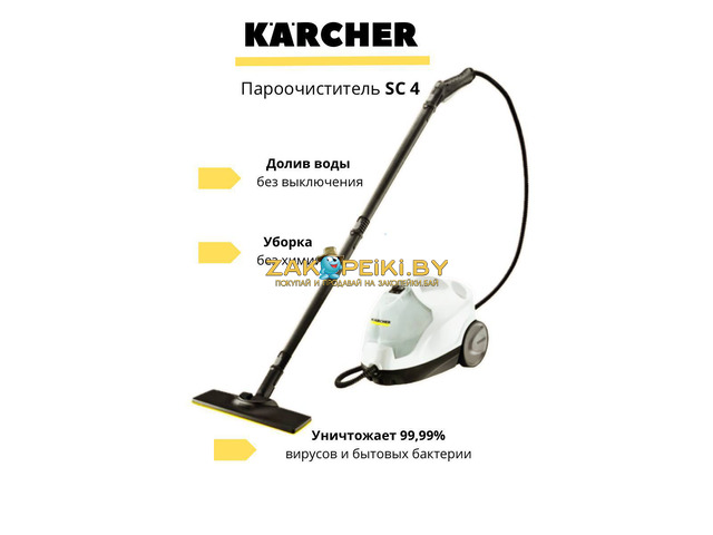 Комфортный в работе пароочиститель Karcher SC4 выполняет уборку без применения каких-либо чистящих средств и может применяться в домашнем хозяйстве практически везде. В том числе на ковровых покрытиях — благодаря входящей в комплект поставки насадке для пола. При тщательной очистке уничтожается 99,99% распространенных в быту бактерий на твердых поверхностях.