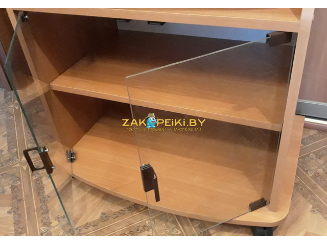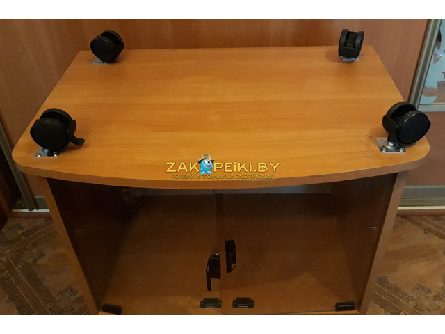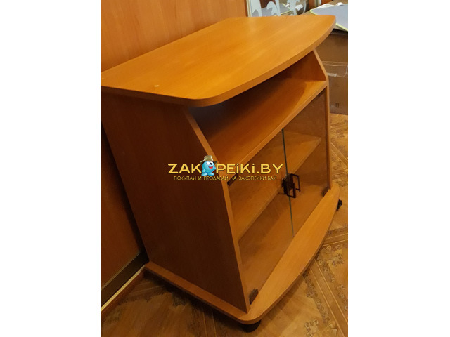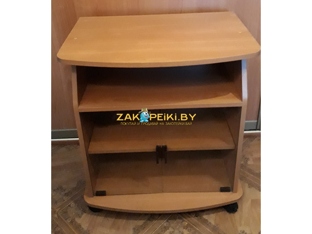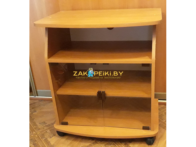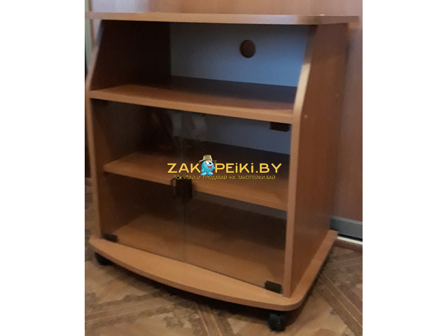 Тумба подставка для ТВ, DVD, винилового проигрывателя, приставной или журнальный столик и т.п.; ширина 64,5см, глубина 45,5см, высота 71,5см, материал – ламинированная ДСП (ЛДСП), с тыльной стороны – ДВП, съемная полка внутри, на колесиках (4шт, одно с тормозом), с фасада 2 стекляные дверцы на завесах, б/у в очень хорошем состоянии. Цена 125рб.