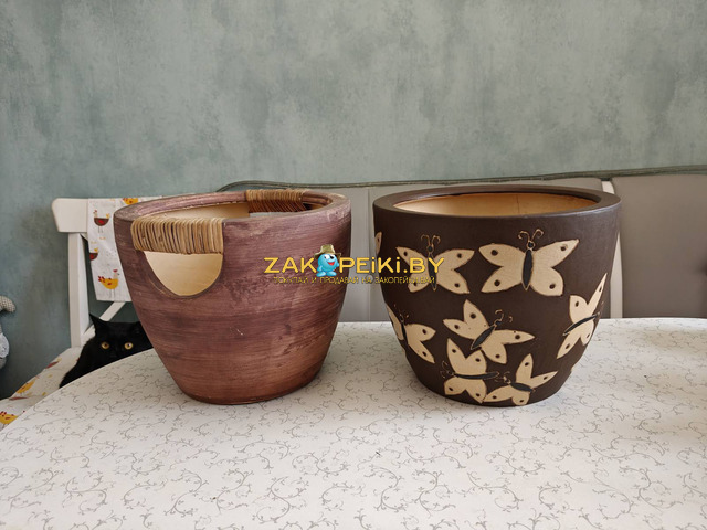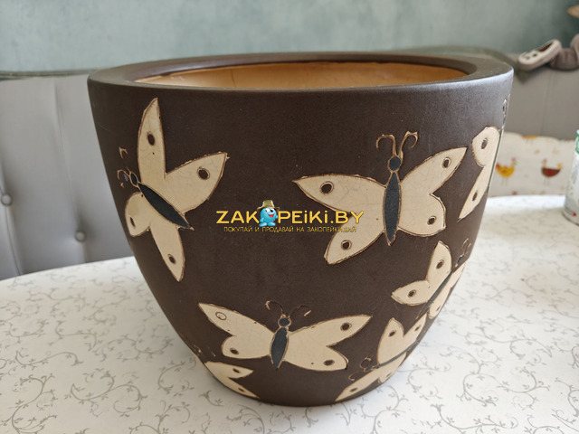Производство – Вьетнам. Состояние кашпо с имеющимися захватами для рук отличное (фотографии №2,3,4). В изделии с изображёнными бабочками имеет место небольшая трещина (фотографии №7,8) в глазурованном покрытии внутри, - в таком случае кашпо можно использовать в декоративных целях, установив вовнутрь кашпо меньшего размера. Для информации: в данный момент из-за этого изъяна изделие не протекает и снаружи выглядит хорошо.