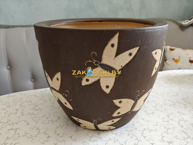 Характеристики кашпо с изображением бабочек: высота 23 см, диаметр верхней части 28,5 см, масса нетто 2,8 кг, полный объём 10 литров.